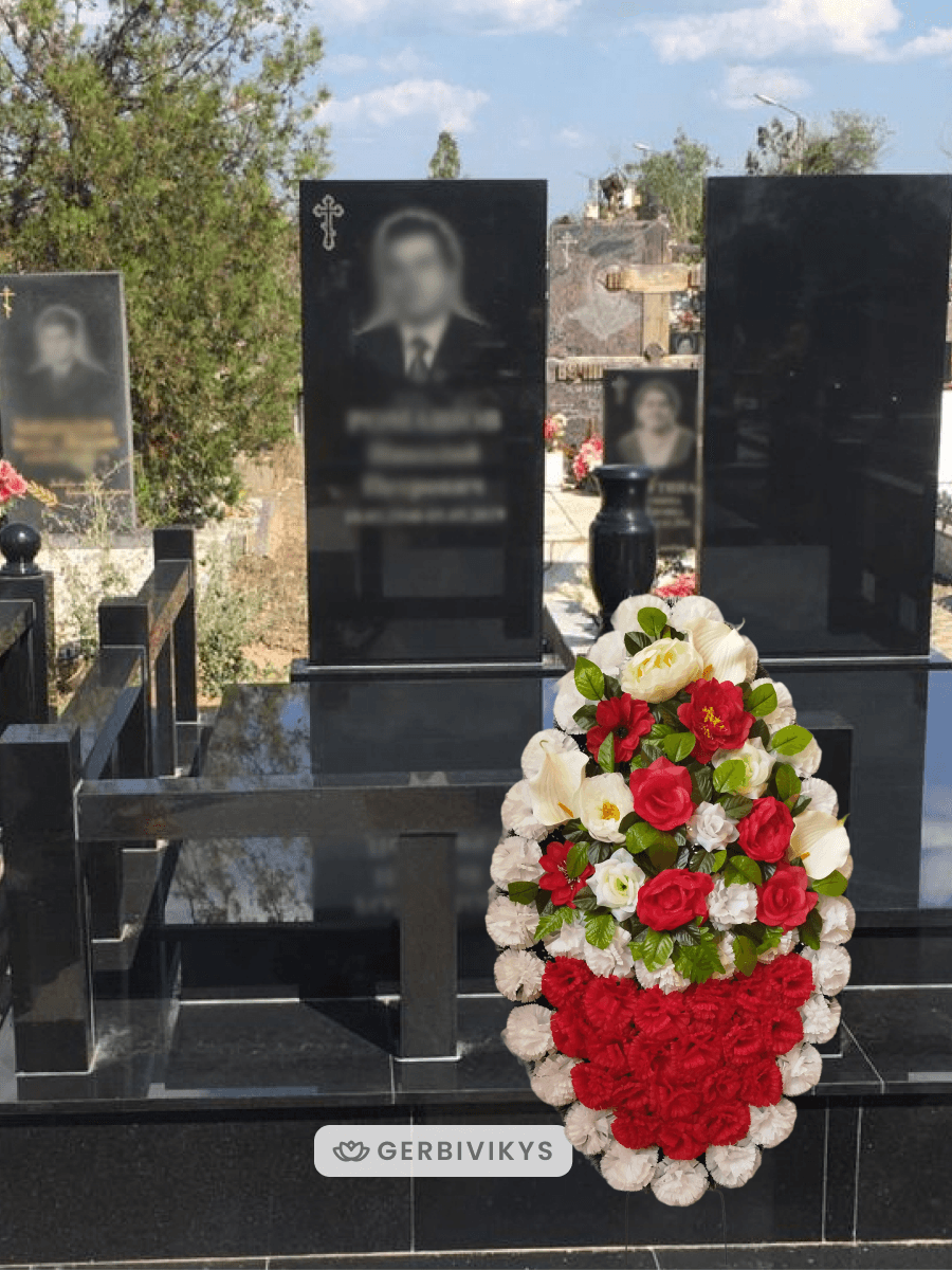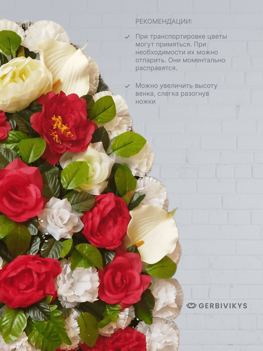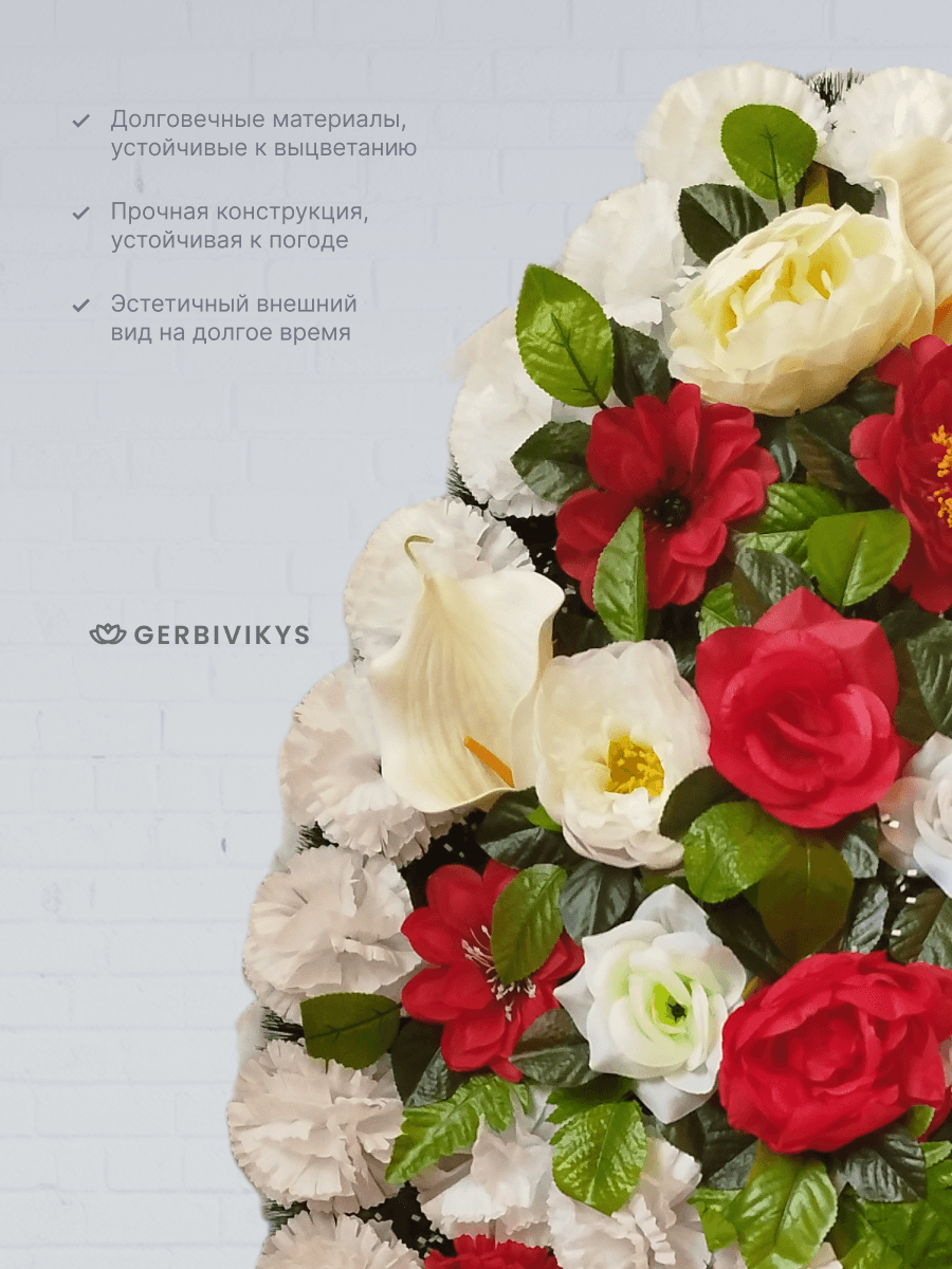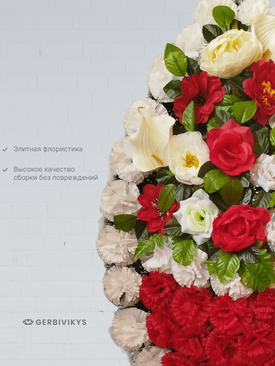 Траурную красно-белую корзину венок на похороны можно укомплектовать лентой премиум качества с надписью. Наши товары собраны из качественных искусственных цветов, устойчивых к воздействию ультрафиолетового излучения и погодных условий. Мы создаем памятные композиции с любовью, вниманием к деталям. Наши изделия долговечны. Прощальная композиция от интернет-магазина Gerbivikys – это не просто декор на могилу, а важный элемент прощания, который помогает выразить глубокие эмоции и уважение к жизни и памяти любимого человека. Перед отправкой венки проходят контроль качества и дополнительное отпаривание. При необходимости венок на похороны может быть упакован в полиэтиленовый пакет высокой плотности. Это позволит избежать повреждения венка при транспортировки. А также защитит Ваши руки от острых металлических элементов каркаса венка. Размеры высота 125 см ширина 65 см.