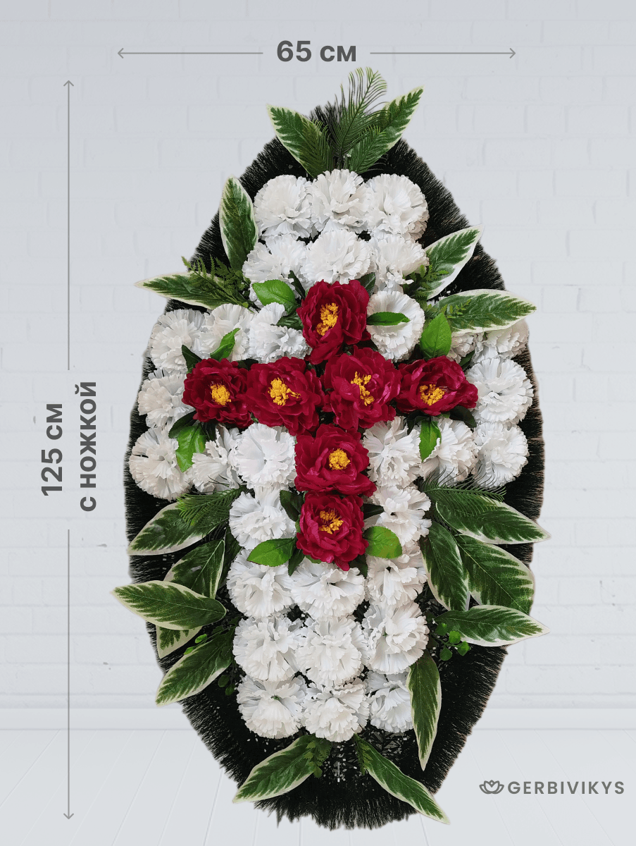 Траурную цветочную композицию венок на похороны крест можно укомплектовать лентой премиум качества с надписью. Наши изделия собраны из качественных искусственных цветов, устойчивых к воздействию ультрафиолетового излучения и погодных условий. Мы создаем памятные композиции с любовью, вниманием к деталям. Наши товары долговечны. Прощальная композиция от интернет-магазина Gerbivikys – это не просто декор на могилу, а важный элемент прощания, который помогает выразить глубокие эмоции и уважение к жизни и памяти любимого человека. Перед отправкой венки проходят контроль качества и дополнительное отпаривание. При необходимости венок на похороны может быть упакован в полиэтиленовый пакет высокой плотности. Это позволит избежать повреждения венка при транспортировки. А также защитит Ваши руки от острых металлических элементов каркаса венка. Размеры высота 125 см ширина 65 см.