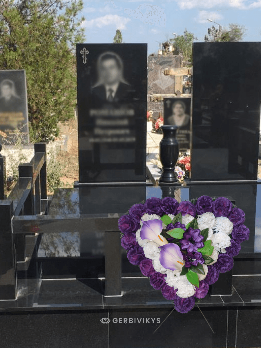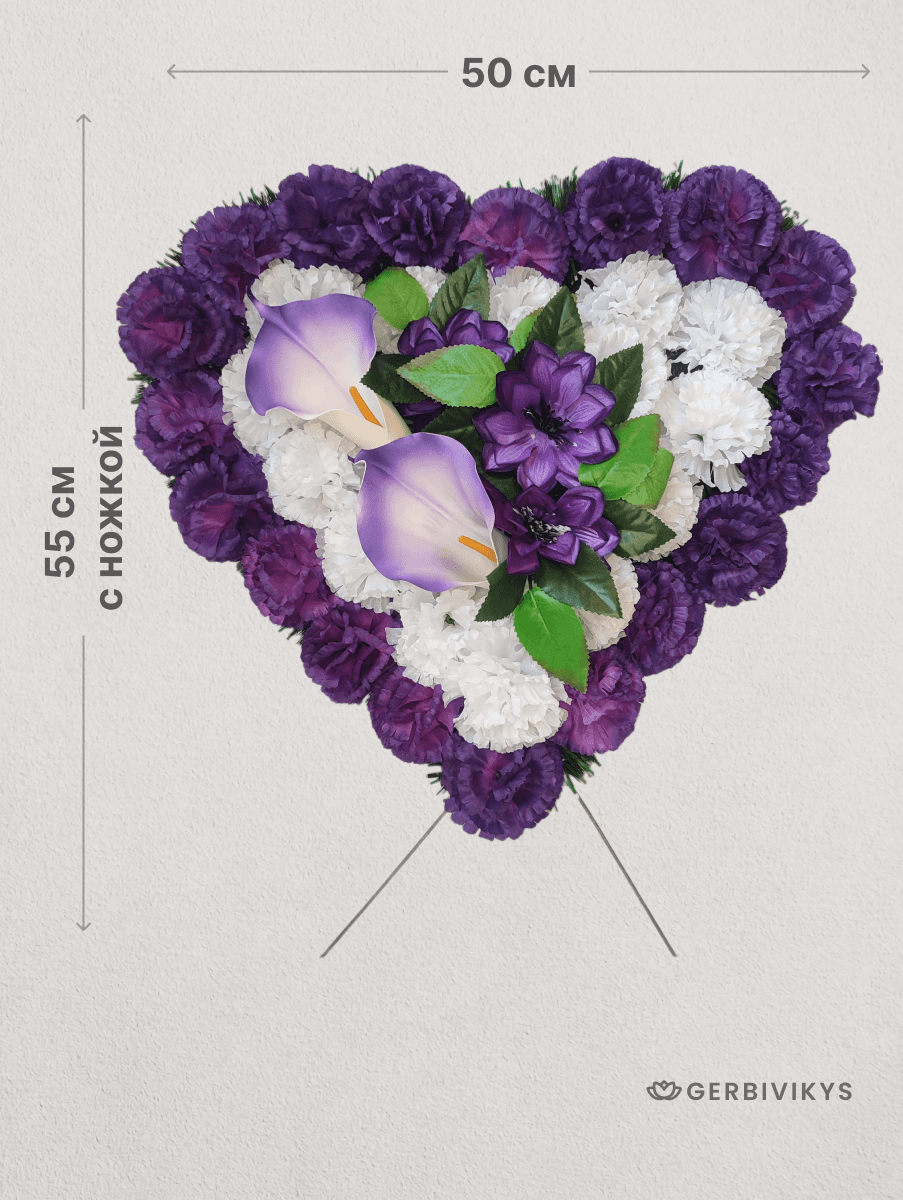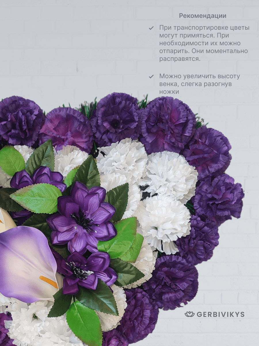 Траурный венок «Фиолетово-белое сердце» — это символ глубокой духовной связи, мудрости и вечной памяти. Утонченное сочетание фиолетового и белого в форме сердца передает возвышенные чувства: где фиолетовый олицетворяет достоинство, уважение и светлую печаль, а белый — чистоту души, покой и вечную жизнь. Траурную композицию венок сердце фиолетово-белое можно укомплектовать лентой премиум качества с надписью. Цветочная композиция собрана из качественных искусственных цветов, устойчивых к воздействию ультрафиолетового излучения и погодных условий. Мы создаем памятные композиции с любовью, вниманием к деталям. Наши товары долговечны. Композиция от интернет-магазина Gerbivikys – это не просто декор на могилу, а важный элемент прощания, который помогает выразить глубокие эмоции и уважение к жизни и памяти любимого человека. Перед отправкой венки проходят контроль качества и дополнительное отпаривание. При необходимости венок на похороны может быть упакован в полиэтиленовый пакет высокой плотности. Это позволит избежать повреждения венка при транспортировки. А также защитит Ваши руки от острых металлических элементов каркаса венка.