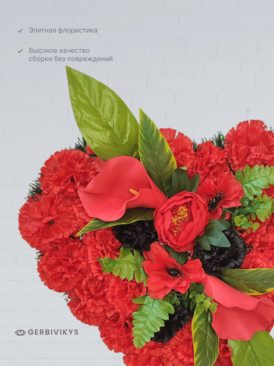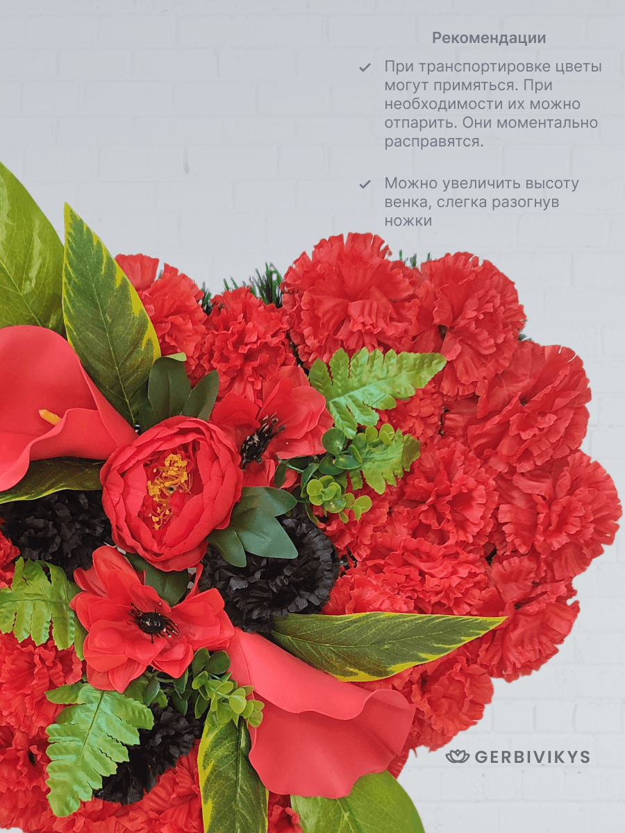 Похоронную композицию венок сердце красно-черное можно укомплектовать лентой премиум качества с надписью. Наши изделия собираются из качественных искусственных цветов, устойчивых к воздействию ультрафиолетового излучения и погодных условий. Мы создаем памятные композиции с любовью, вниманием к деталям. Наши товары долговечны. Композиция от интернет-магазина Гербивикус – это не просто декор на могилу, а важный элемент прощания, который помогает выразить глубокие эмоции и уважение к жизни и памяти любимого человека. Перед отправкой наши товары проходят контроль качества и дополнительное отпаривание. При необходимости венок на похороны может быть упакован в полиэтиленовый пакет высокой плотности. Это позволит избежать повреждения траурного венка при транспортировки. А также защитит Ваши руки от острых металлических элементов каркаса венка.