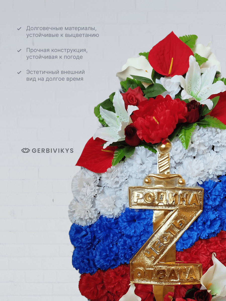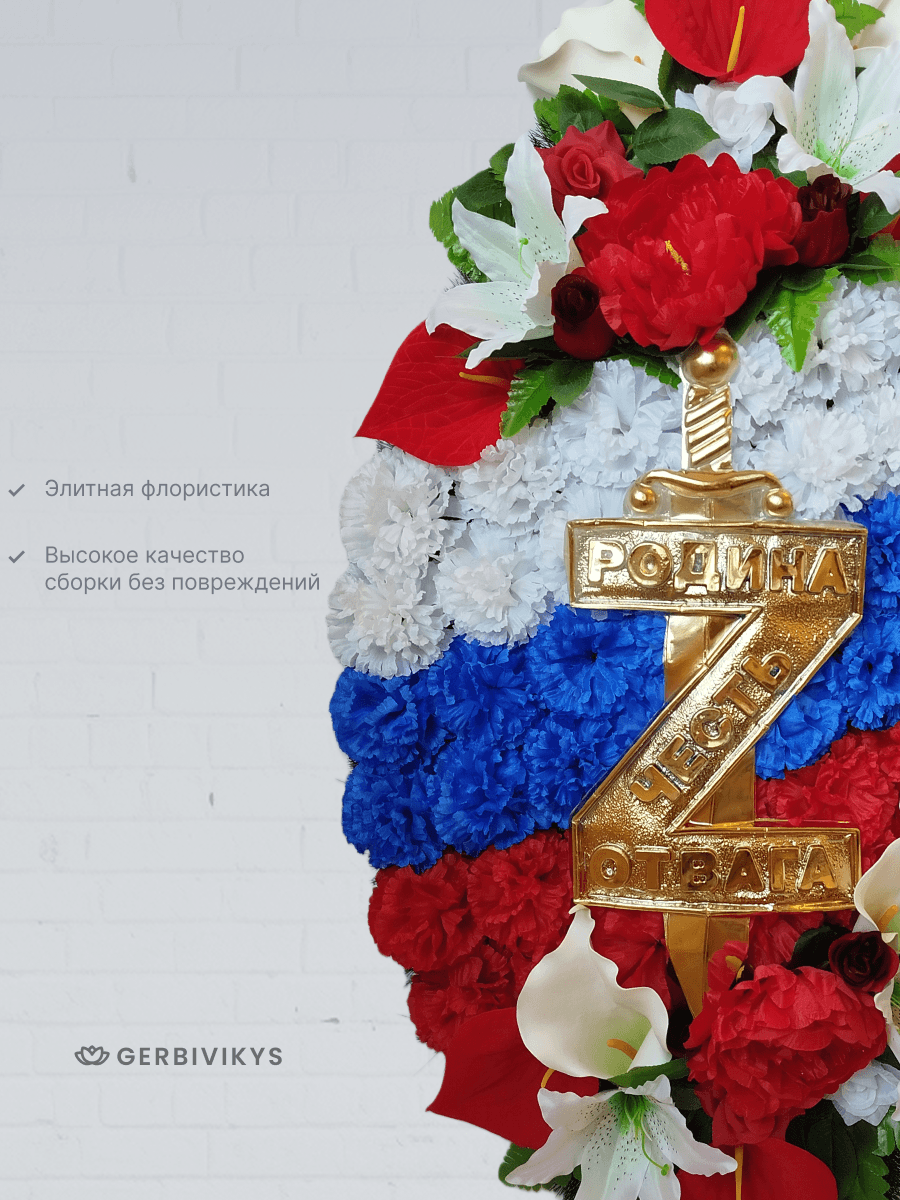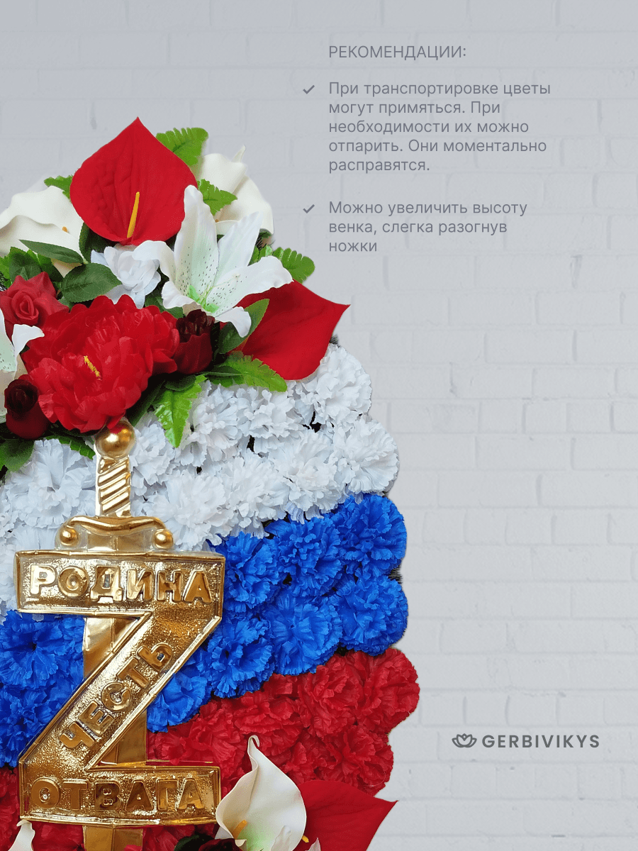 Ритуальную композицию венок на похороны триколор с буквой Z можно укомплектовать лентой премиум качества с надписью. Наши изделия собраны из качественных искусственных цветов, устойчивых к воздействию ультрафиолетового излучения и погодных условий. Мы создаем памятные композиции с любовью, вниманием к деталям. Наши товары долговечны. Прощальные композиции от интернет-магазина Gerbivikys – это не просто декор на могилу, а важный элемент прощания, который помогает выразить глубокие эмоции и уважение к жизни и памяти любимого человека. При необходимости венок на похороны может быть упакован в полиэтиленовый пакет высокой плотности. Это позволит избежать повреждения венка при транспортировки. А также защитит Ваши руки от острых металлических элементов каркаса венка. Размеры высота 125 см ширина 65 см.