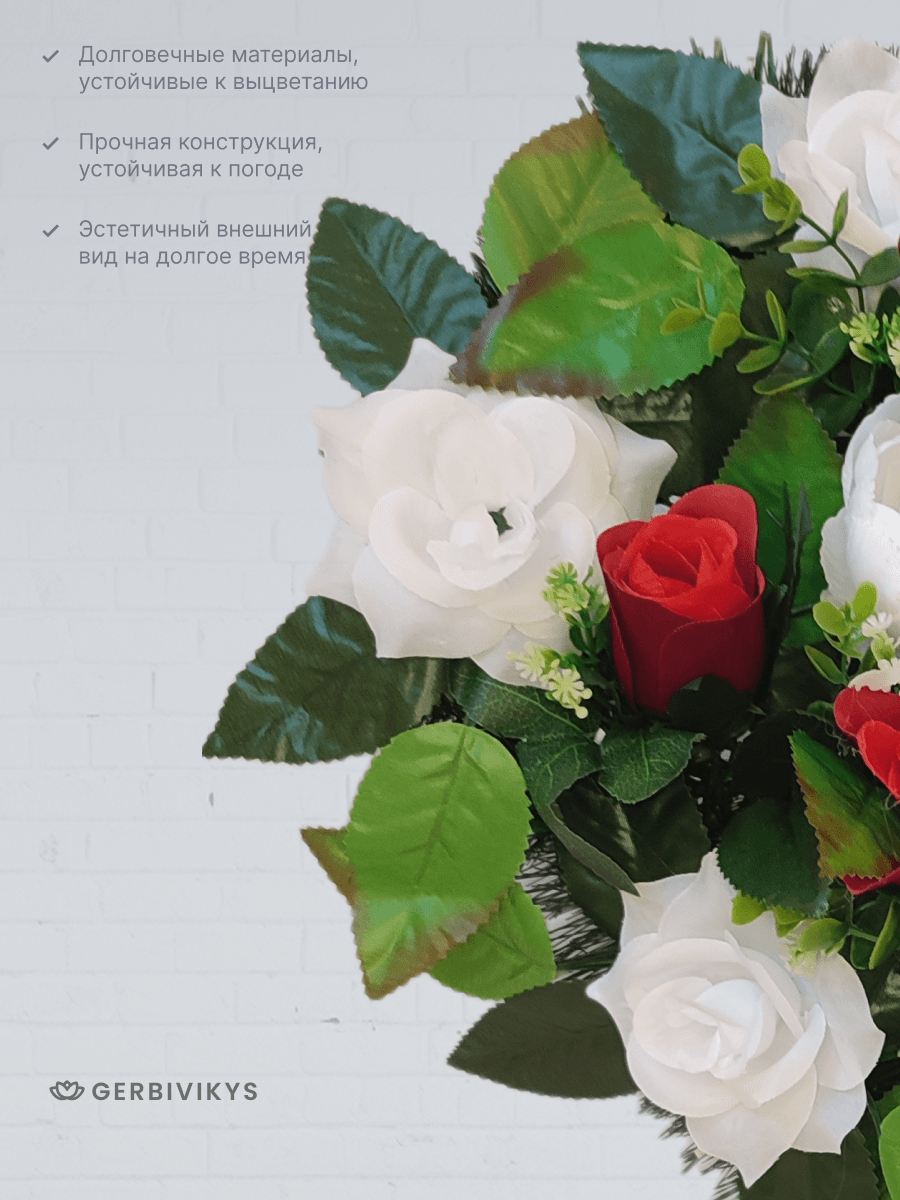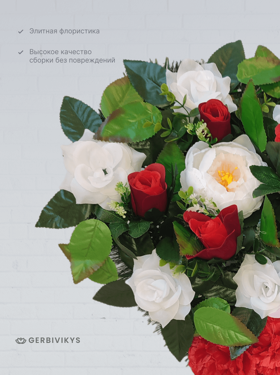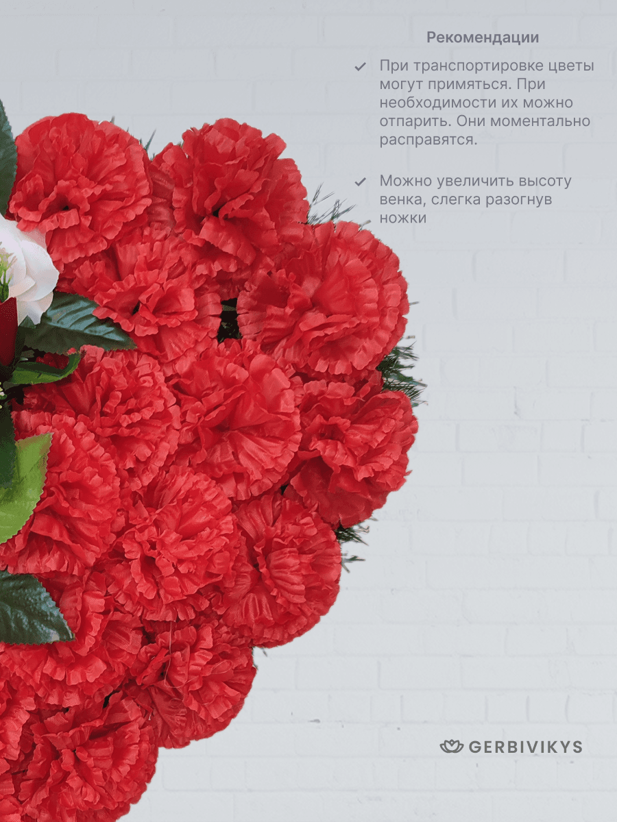 Венок на похороны сердце красно-белое можно укомплектовать траурной лентой премиум качества с надписью. Цветочная композиция собрана из качественных искусственных цветов, устойчивых к воздействию ультрафиолетового излучения и погодных условий. Мы создаем памятные композиции с любовью, вниманием к деталям. Наши товары долговечны. Прощальная цветочная композиция от интернет-магазина Гербивикус – это не просто декор на могилу, а важный элемент прощания, который помогает выразить глубокие эмоции и уважение к жизни и памяти любимого человека. Перед отправкой наша изделия проходят контроль качества и дополнительное отпаривание. При необходимости венок на похороны может быть упакован в полиэтиленовый пакет высокой плотности. Это позволит избежать повреждения венка при транспортировки. А также защитит Ваши руки от острых металлических элементов каркаса венка.