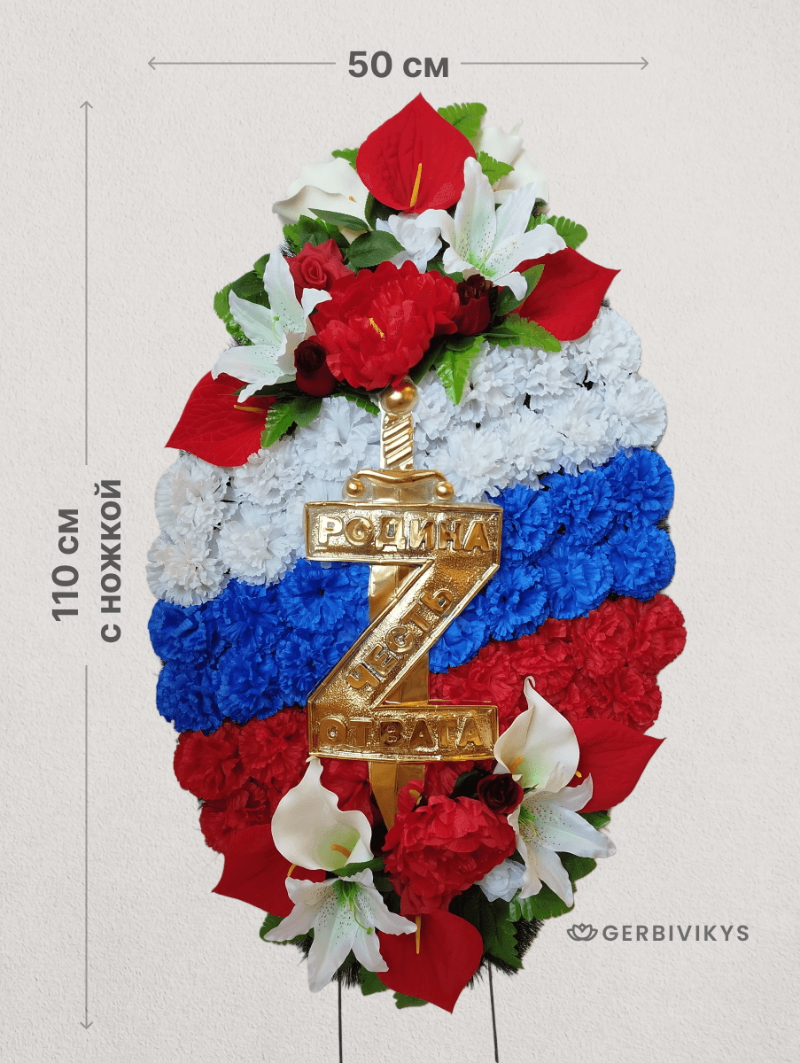 Ритуальную композицию венок на похороны триколор с буквой Z можно укомплектовать лентой премиум качества с надписью. Композиция выдержана в точной гамме государственного флага: белый, синий и красный, с доминирующим акцентом буквы Z в центре. Такое цветовое решение превращает траурный венок в зримое воплощение уважения, долга и связи усопшего со службой Отечеству. Идеально подходит для прощания с военными, ветеранами, государственными и общественными деятелями. Наши изделия собраны из качественных искусственных цветов, устойчивых к воздействию ультрафиолетового излучения и погодных условий. Мы создаем памятные композиции с любовью, вниманием к деталям. Наши товары долговечны. Прощальные композиции от интернет-магазина Gerbivikys – это не просто декор на могилу, а важный элемент прощания, который помогает выразить глубокие эмоции и уважение к жизни и памяти любимого человека. При необходимости венок на похороны может быть упакован в полиэтиленовый пакет высокой плотности. Это позволит избежать повреждения венка при транспортировки. А также защитит Ваши руки от острых металлических элементов каркаса венка. Размеры высота 110 см ширина 60 см.