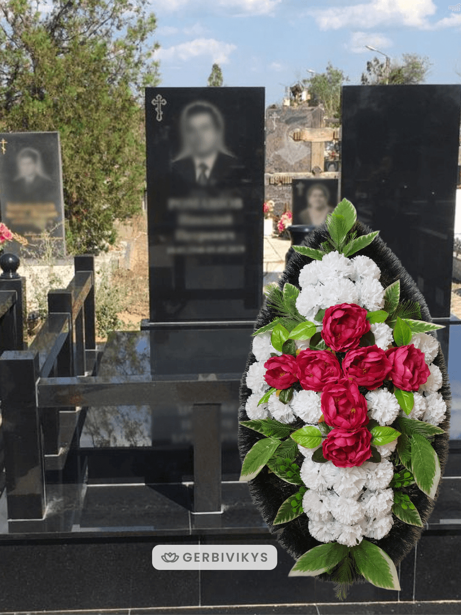 Венок крест можно укомплектовать траурной лентой премиум качества с надписью. Венок похоронный на поминки крепится в землю с помощью ножек. Искусственный венок на кладбище собран из качественных искусственных цветов, устойчивых к воздействию ультрафиолетового излучения и погодных условий. Венок на похороны используют для возложения на могилу к ушедшим от нас мужчинам и женщинам. Мы создаем памятные композиции с любовью, вниманием к деталям. Наши ритуальные товары долговечны. Похоронный венок от Gerbivikys – это не просто декор на могилу, а важный элемент прощания, который помогает выразить глубокие эмоции и уважение к жизни и памяти любимого человека. Перед отправкой венки проходят контроль качества и дополнительное отпаривание. При транспортировке цветы могут примяться, рекомендуем их слегка отпарить при необходимости.